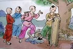 Đến kinh đô Trung-quốc, bốn chàng tìm vào hoàng cung. Một toán lính gác cổng cản lại không cho vào. Cả bọn nổi xung lên, nói: